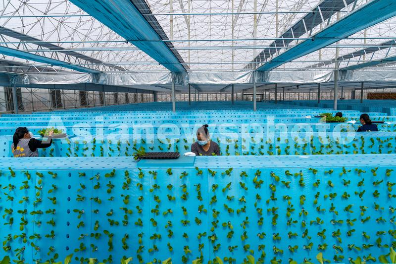 图片说明:2022年3月16日,安徽省合肥市肥东县桥头集镇安徽现代雾耕农业科技示范园植物工厂温室内,工人们在栽种气雾栽培蔬菜。