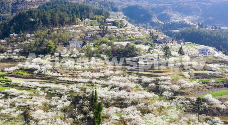 图片说明:2022年3月15日,重庆市南川区金山镇院星村漫山绽放的李花犹如皑皑白雪美如画卷(无人机航拍)。