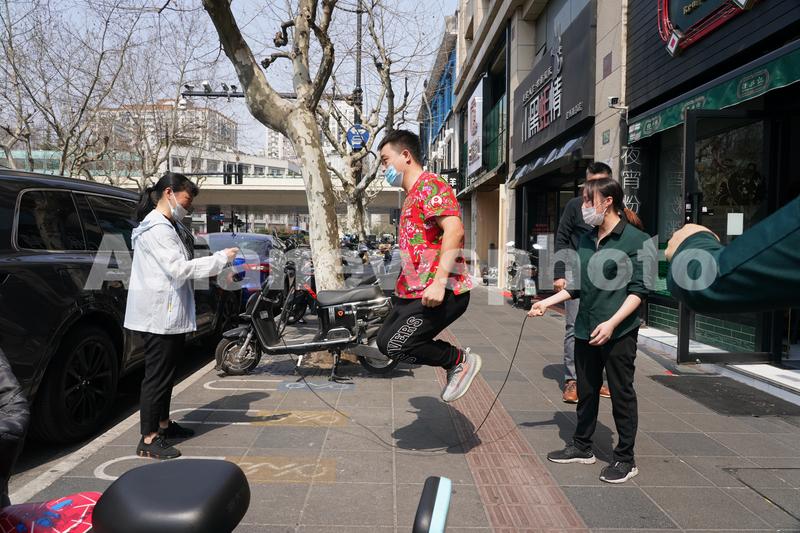 图片说明:2022年3月14日中午,上海市定西路饭店门口,正在跳绳健身的饭店工作人员。本来应该繁忙的午餐时间,受疫情影响用餐顾客变少了。