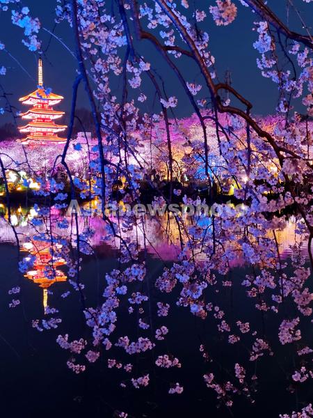 2022年3月15日,湖北省武汉东湖占地520亩樱花园里上万株樱花,已进入盛花期,园内花开率达70%左右。不论是白天,还是夜幕降临,各色樱花争艳,艳丽夺目。五颜六色,流光溢彩的樱园夜景,吸引不少市民与外地游客前来赏花观美景。