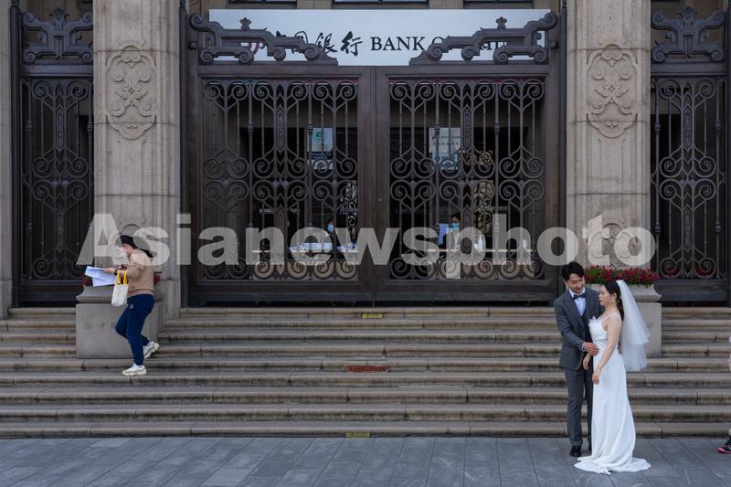 图片说明:2022年3月15日,一对准新人在上海外滩一家银行门前拍摄婚纱照。据了解,受疫情影响,这家银行营业大厅暂停开放,工作人员将服务柜台摆在门口为顾客提供服务。