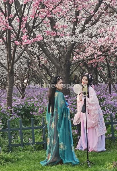 2022年3月15日,湖北省武汉东湖占地520亩樱花园里上万株樱花,已进入盛花期,园内花开率达70%左右。不论是白天,还是夜幕降临,各色樱花争艳,艳丽夺目。五颜六色,流光溢彩的樱园夜景,吸引不少市民与外地游客前来赏花观美景。