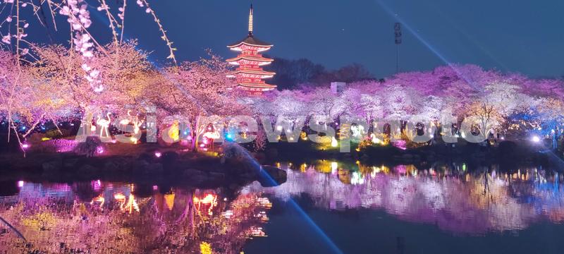 2022年3月15日,湖北省武汉东湖占地520亩樱花园里上万株樱花,已进入盛花期,园内花开率达70%左右。不论是白天,还是夜幕降临,各色樱花争艳,艳丽夺目。五颜六色,流光溢彩的樱园夜景,吸引不少市民与外地游客前来赏花观美景。