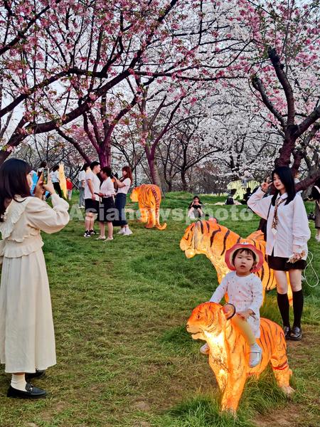 2022年3月15日,湖北省武汉东湖占地520亩樱花园里上万株樱花,已进入盛花期,园内花开率达70%左右。不论是白天,还是夜幕降临,各色樱花争艳,艳丽夺目。五颜六色,流光溢彩的樱园夜景,吸引不少市民与外地游客前来赏花观美景。