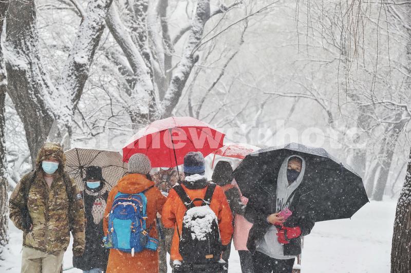 2022年3月18日,北京迎来降雪天气,游客冒雪在故宫、颐和园等景点欣赏雪景。当日上午,北京市气象台发布暴雪蓝色预警。
