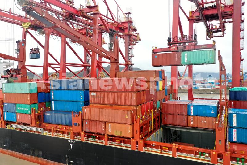 2022年3月21日上午,中国香港籍的“那迪首领”号集装箱轮,在宁波舟山港金塘港区大浦口集装箱码头进行1405标箱货物的装卸作业。