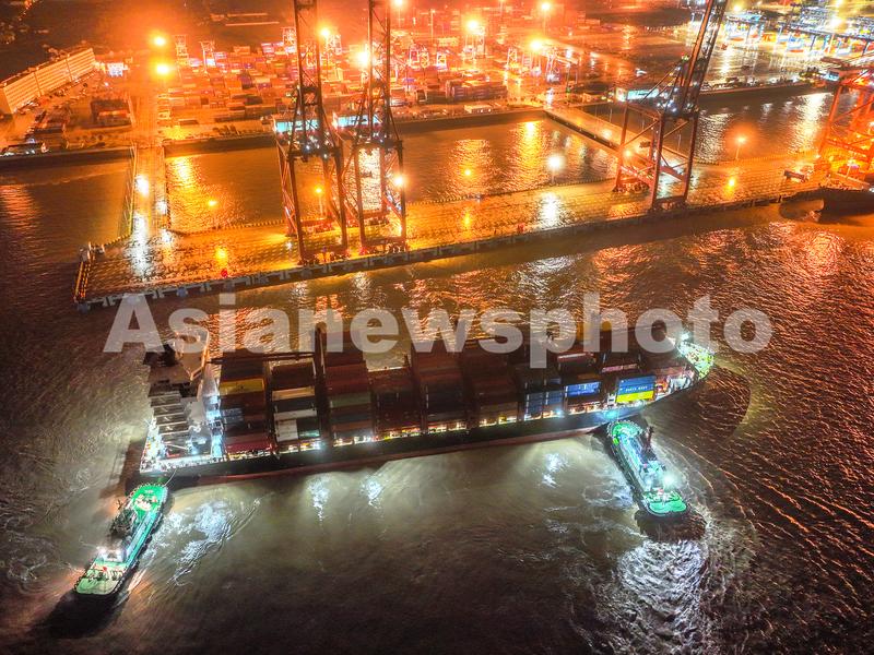 2022年3月20日晚,中国香港籍的“那迪首领”号集装箱轮,靠泊宁波舟山港金塘港区大浦口集装箱码头,将进行1405标箱货物的装卸作业。