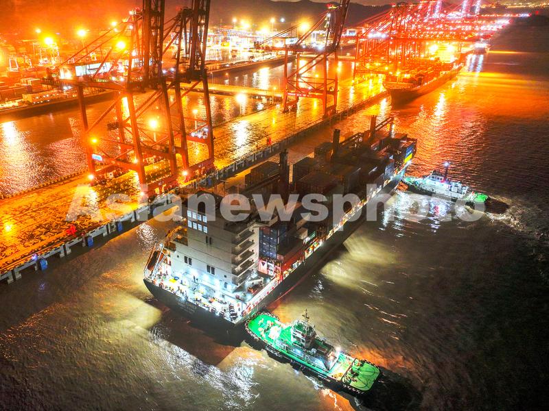 2022年3月20日晚,中国香港籍的“那迪首领”号集装箱轮,靠泊宁波舟山港金塘港区大浦口集装箱码头,将进行1405标箱货物的装卸作业。