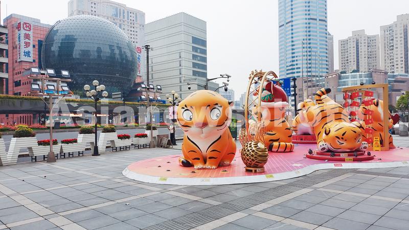 图片说明:2022年3月19日,上海,疫情防控下的市中心徐家汇商圈街头车辆、行人稀少。虎年老虎祝福雕塑让人怀念春节期间的闹市景象。