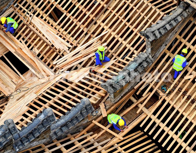 图片说明:2022年3月21日,江西省赣州市南康区唐江镇卢屋村古建筑群修缮项目施工现场,工人们在更换铺设古建筑瓦面支撑木。