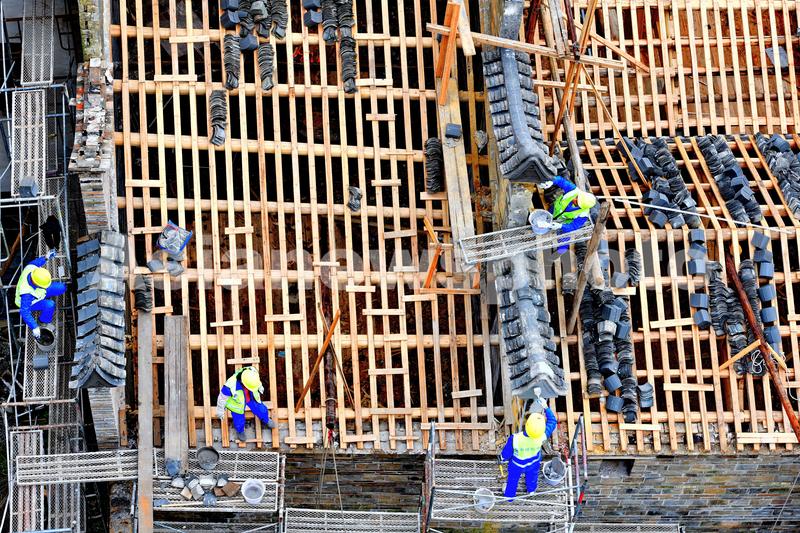 图片说明:2022年3月21日,江西省赣州市南康区唐江镇卢屋村古建筑群修缮项目施工现场,工人们在更换铺设古建筑瓦面支撑木。