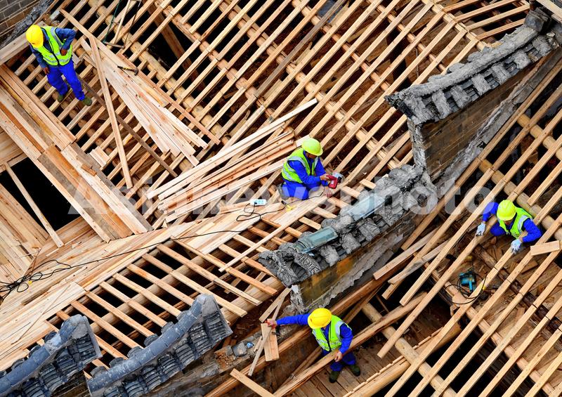 图片说明:2022年3月21日,江西省赣州市南康区唐江镇卢屋村古建筑群修缮项目施工现场,工人们在更换铺设古建筑瓦面支撑木。