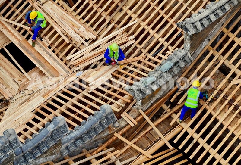 图片说明:2022年3月21日,江西省赣州市南康区唐江镇卢屋村古建筑群修缮项目施工现场,工人们在更换铺设古建筑瓦面支撑木。