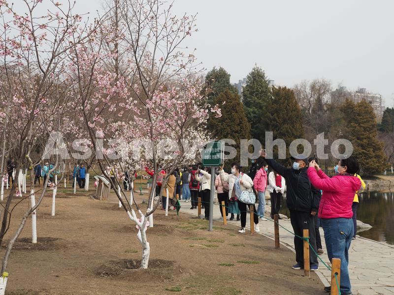 图片说明:2022年3月23日,北京玉渊潭公园内,游客在观赏樱花。