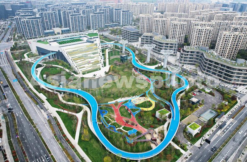 2022年3月23日,从空中俯瞰杭州李宁体育公园。当日,李宁体育园在杭州投入试运营,成为市民新的体育锻炼点,而园内约700米长的空中跑道更是吸引不少市民前来打卡体验。