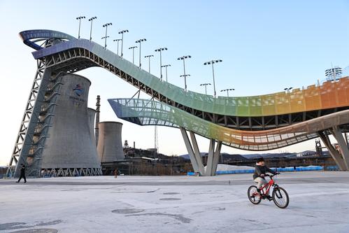 3月21日,小朋友在首钢滑雪大跳台区域骑着自行车。