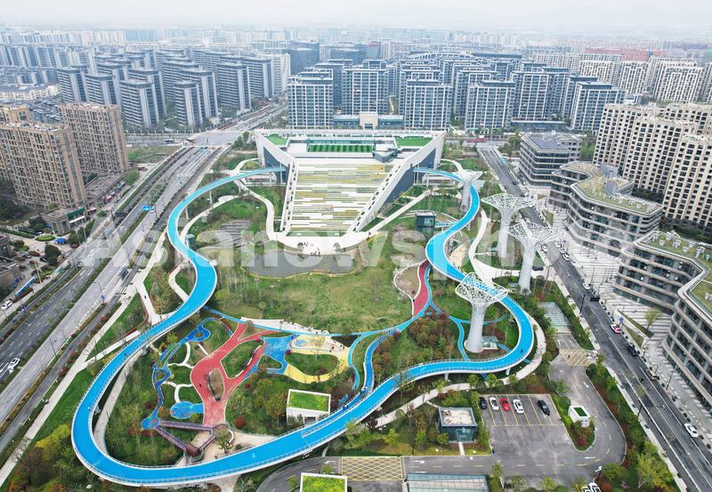 2022年3月23日,从空中俯瞰杭州李宁体育公园。当日,李宁体育园在杭州投入试运营,成为市民新的体育锻炼点,而园内约700米长的空中跑道更是吸引不少市民前来打卡体验。