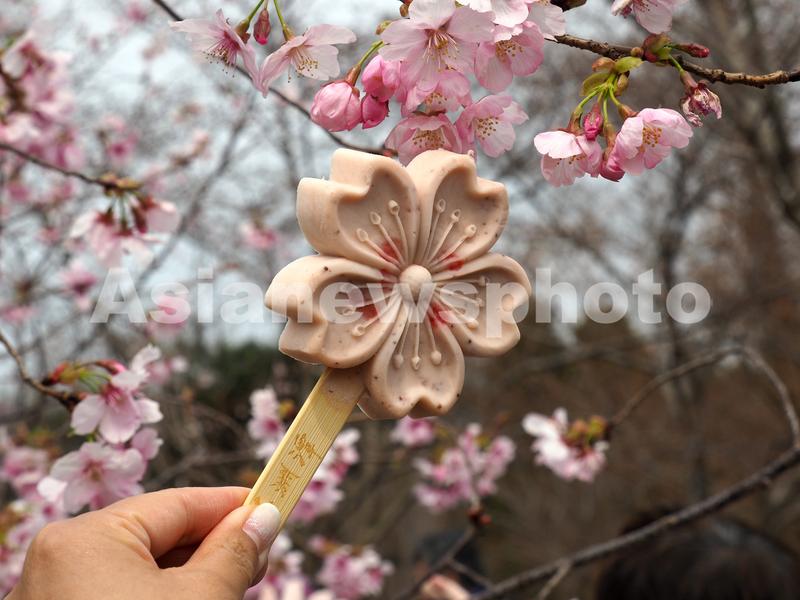 图片说明:2022年3月23日,北京玉渊潭公园内,游客手举樱花造型冰激凌拍照留影。