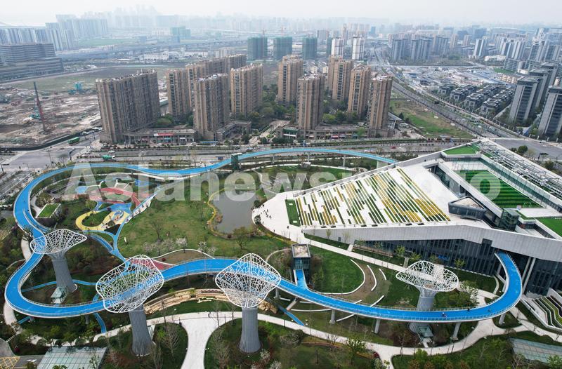 2022年3月23日,从空中俯瞰杭州李宁体育公园。当日,李宁体育园在杭州投入试运营,成为市民新的体育锻炼点,而园内约700米长的空中跑道更是吸引不少市民前来打卡体验。