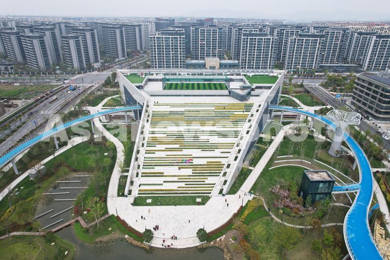 2022年3月23日,从空中俯瞰杭州李宁体育公园。当日,李宁体育园在杭州投入试运营,成为市民新的体育锻炼点,而园内约700米长的空中跑道更是吸引不少市民前来打卡体验。