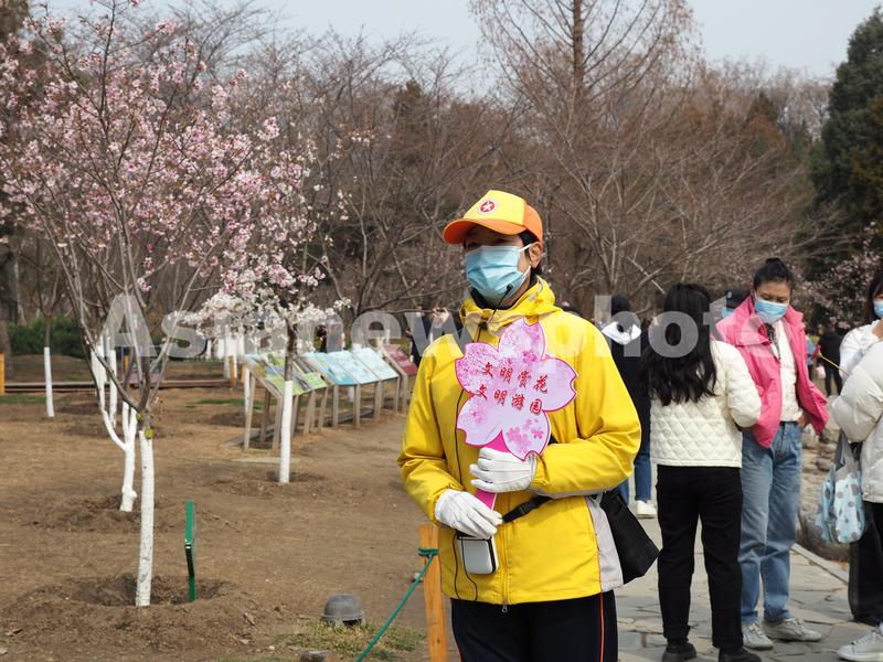 图片说明:2022年3月23日,北京玉渊潭公园内,首都公共文明引导员手举提示牌,提醒游客“文明游园 安全赏花”。