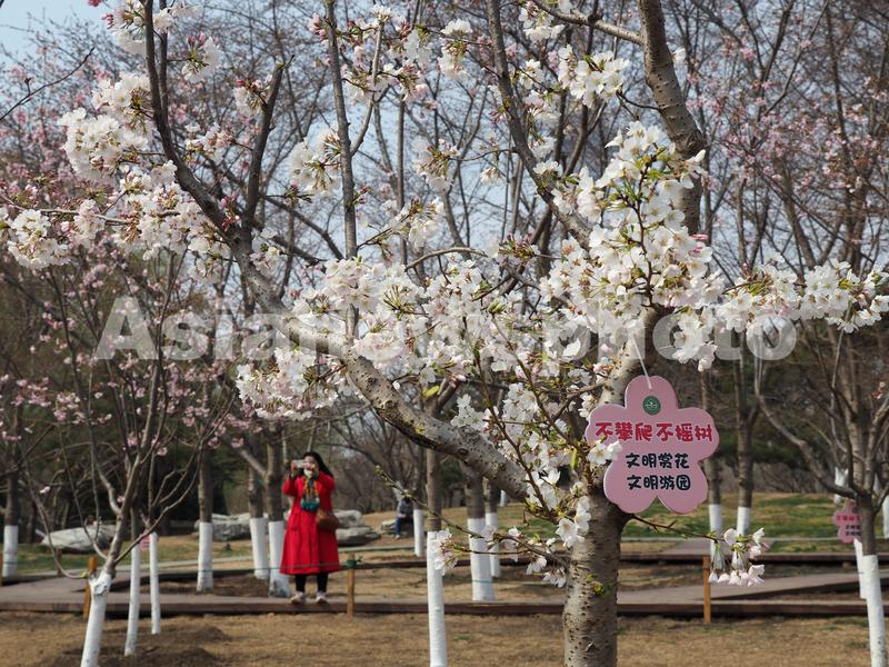 图片说明:2022年3月23日,北京玉渊潭公园的樱花树上,悬挂着“文明赏花 文明游园”的提示牌。