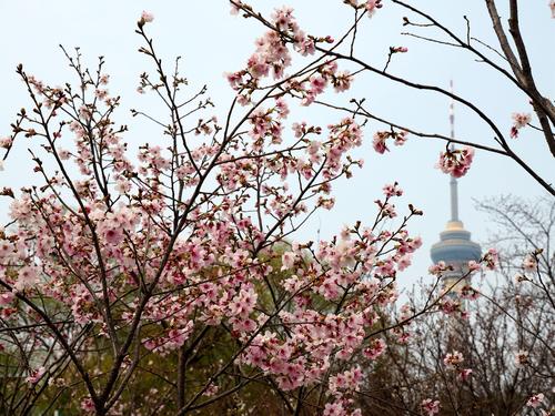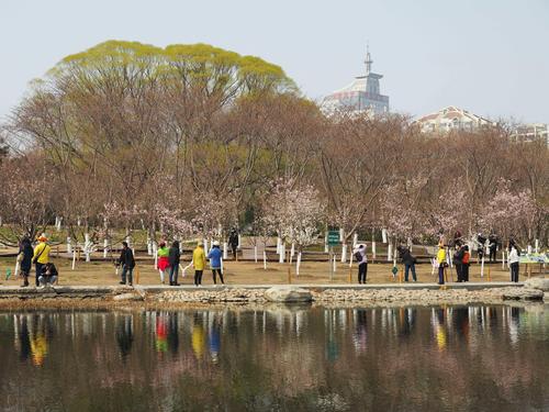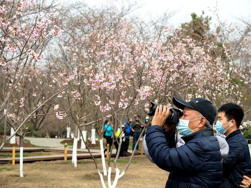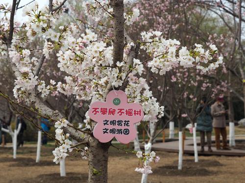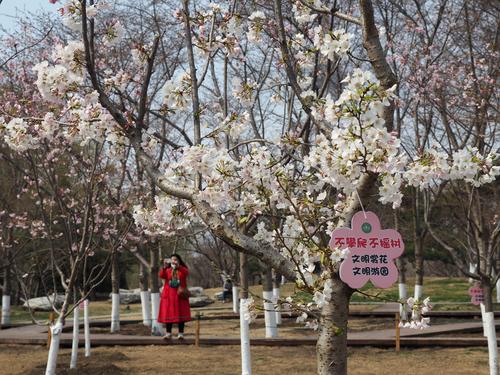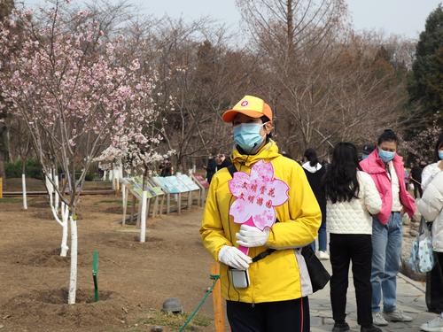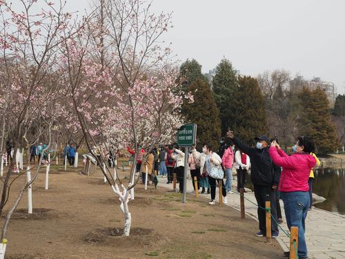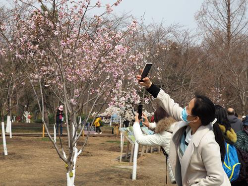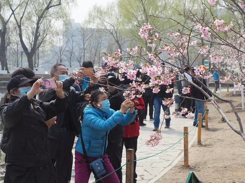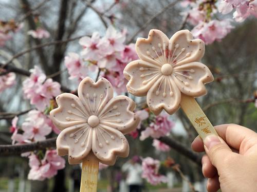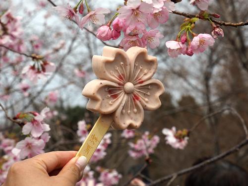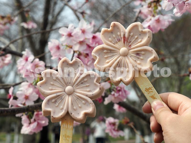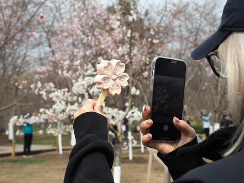 图片说明:2022年3月23日,北京玉渊潭公园内,游客手举樱花造型冰激凌拍照留影。