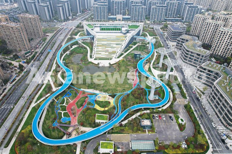 2022年3月23日,从空中俯瞰杭州李宁体育公园。当日,李宁体育园在杭州投入试运营,成为市民新的体育锻炼点,而园内约700米长的空中跑道更是吸引不少市民前来打卡体验。