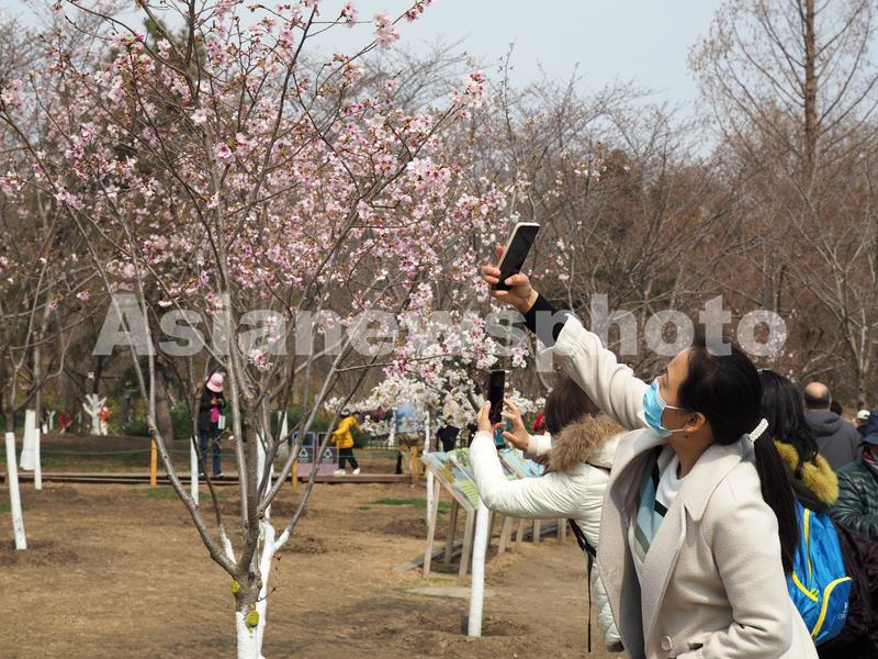 图片说明:2022年3月23日,北京玉渊潭公园内,游客在观赏樱花。