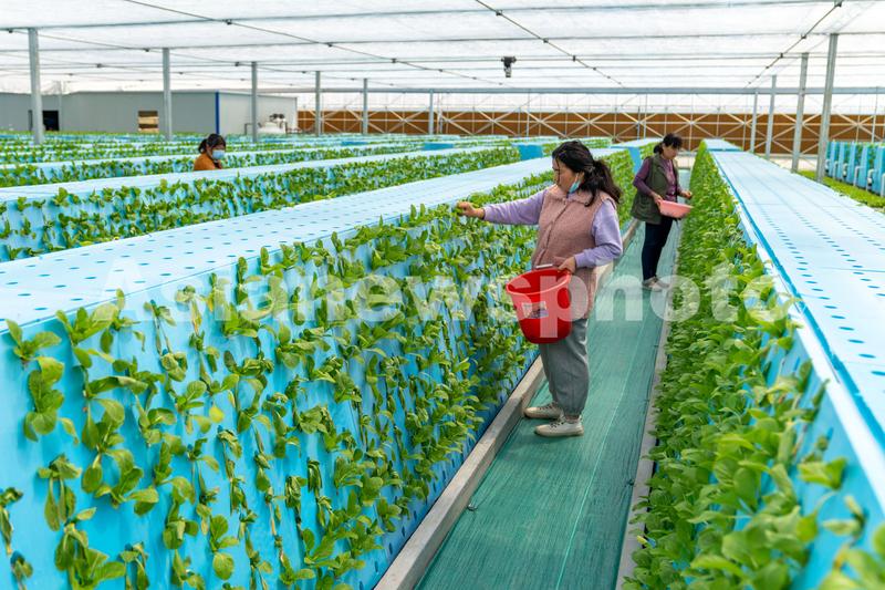 图片说明:2022年3月28日, 安徽省合肥市肥东县桥头集镇安徽现代雾耕农业科技示范园植物工厂温室内,工人们在管护立体气雾技术栽培的蔬菜,去除枯叶。