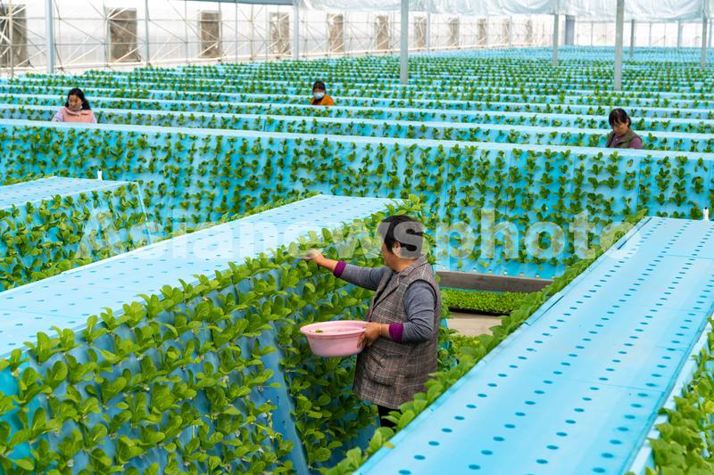 图片说明:2022年3月28日, 安徽省合肥市肥东县桥头集镇安徽现代雾耕农业科技示范园植物工厂温室内,工人们在管护立体气雾技术栽培的蔬菜,去除枯叶。