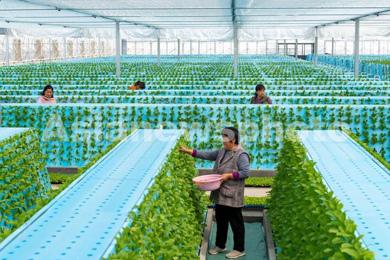 图片说明:2022年3月28日, 安徽省合肥市肥东县桥头集镇安徽现代雾耕农业科技示范园植物工厂温室内,工人们在管护立体气雾技术栽培的蔬菜,去除枯叶。