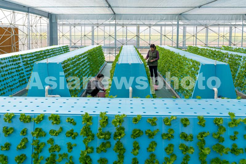 图片说明:2022年3月28日, 安徽省合肥市肥东县桥头集镇安徽现代雾耕农业科技示范园植物工厂温室内,工人们在管护立体气雾技术栽培的蔬菜,去除枯叶。