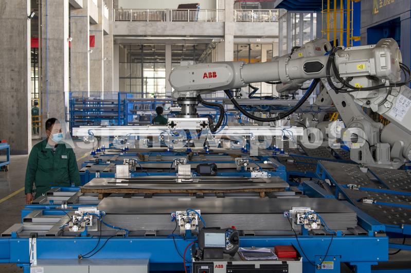 图片说明:2022年3月29日,浙江省永康市首个“未来工厂”王力安防防盗安全门智能制造基地门板自动冲压生产线上,机器人手臂准确快速地抓取和投放门板,进行智能化生产。
