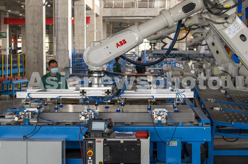 图片说明:2022年3月29日,浙江省永康市首个“未来工厂”王力安防防盗安全门智能制造基地门板自动冲压生产线上,机器人手臂准确快速地抓取和投放门板,进行智能化生产。