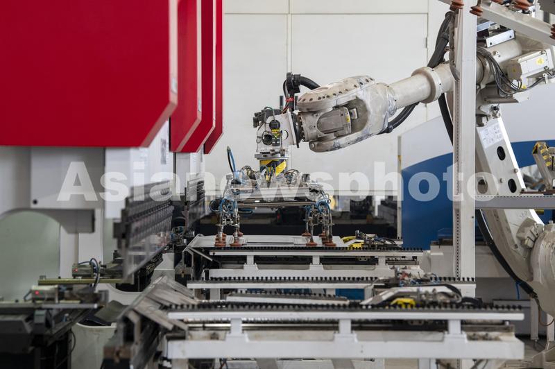 图片说明:2022年3月29日,浙江省永康市首个“未来工厂”王力安防防盗安全门智能制造基地门板自动冲压生产线上,机器人手臂准确快速地抓取和投放门板,进行智能化生产。