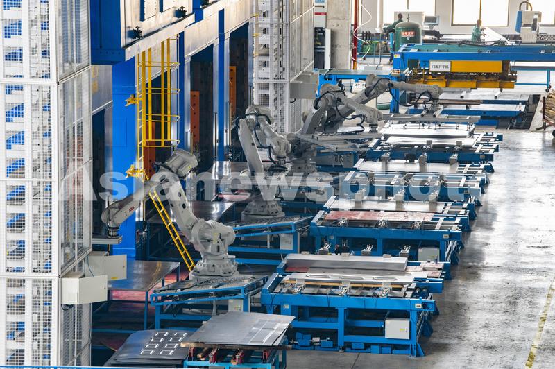 图片说明:2022年3月29日,浙江省永康市首个“未来工厂”王力安防防盗安全门智能制造基地门板自动冲压生产线上,机器人手臂准确快速地抓取和投放门板,进行智能化生产。