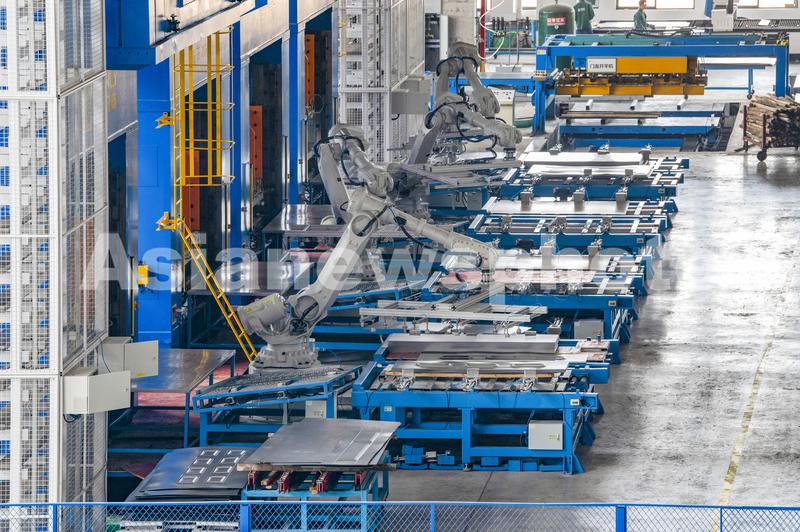 图片说明:2022年3月29日,浙江省永康市首个“未来工厂”王力安防防盗安全门智能制造基地门板自动冲压生产线上,机器人手臂准确快速地抓取和投放门板,进行智能化生产。