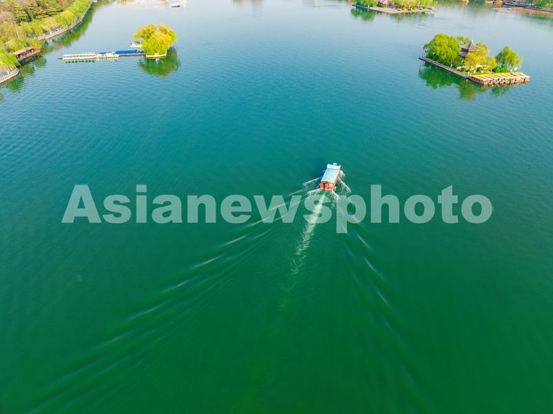 2022年4月1日,山东济南大明湖景区风和日丽,碧波荡漾,春暖花开,风光秀美。