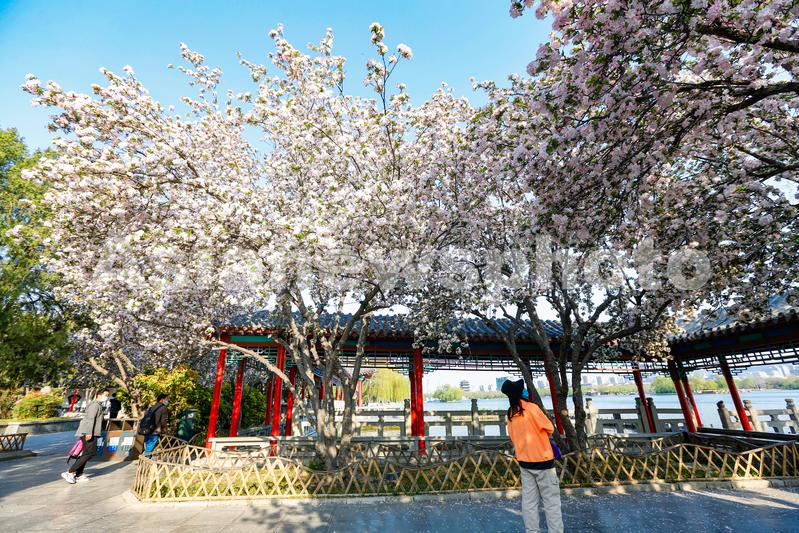 2022年4月1日,山东济南大明湖景区盛开的海棠花吸引游人观赏。