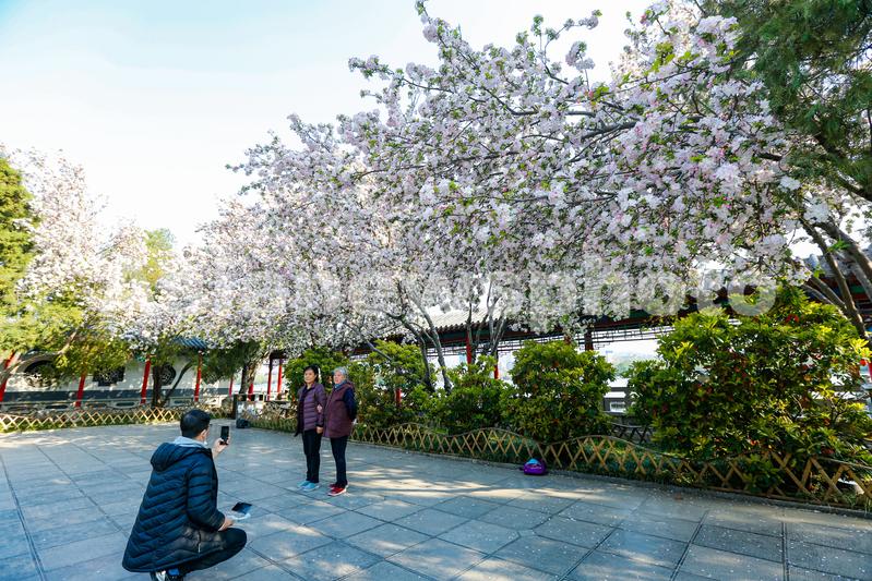 2022年4月1日,山东济南大明湖景区盛开的海棠花吸引游人观赏。