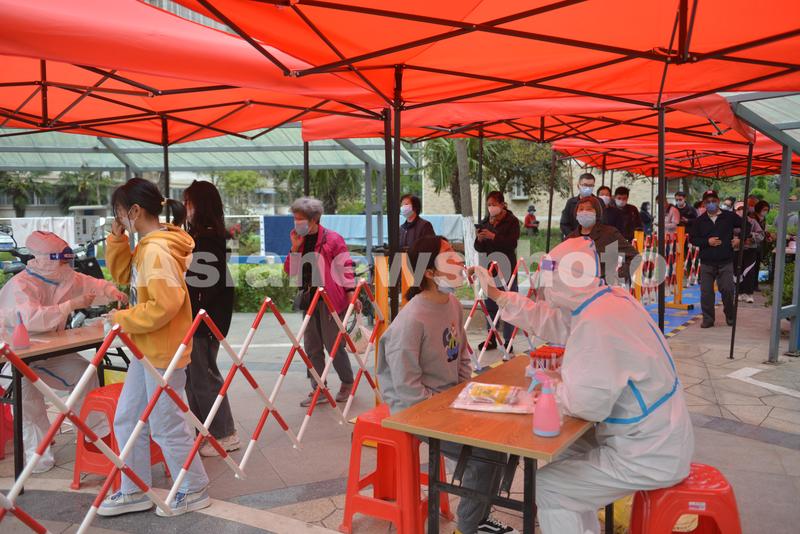 2022年4月4日,安徽省六安市金安区一小区,工作人员正在为居民进行核酸检测。
