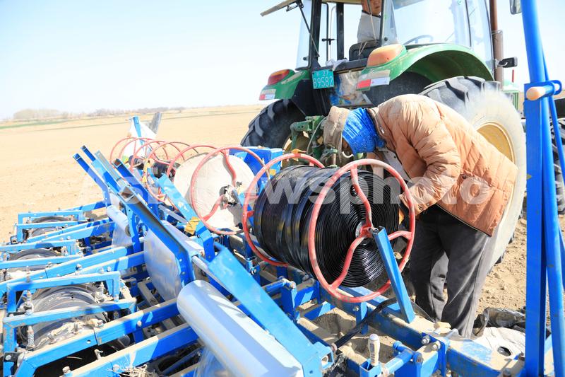 2022年4月7日,新疆兵团第五师双河市八十四团二连4号地,播种机播种玉米。