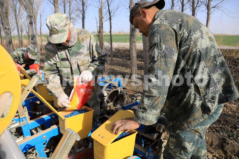 2022年4月7日,新疆兵团第五师双河市八十四团二连4号地,播种机播种玉米。