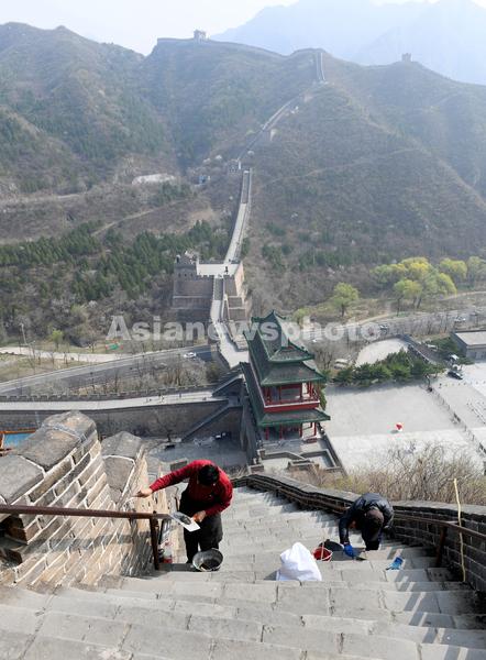近日,在北京居庸关长城景区对辖区长城展开全面破损检查及修复工作。工人师傅两人一组分段,对整个景区长城墙体、地砖破损进行检查,发现破损之处,工人师傅将及时利用粘结灰进行修复。据悉,在修复工程中,不影响游人的正常游览。
