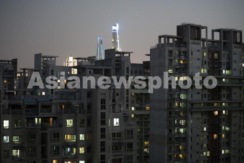 图片说明:2022年4月8日,上海浦西封控第八天,杨浦区周家嘴路附近住宅区的灯光。