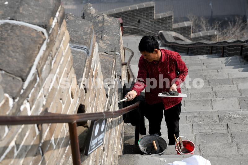 2022年4月9日,在北京居庸关长城景区,维修工人对长城破损局部进行修复作业。