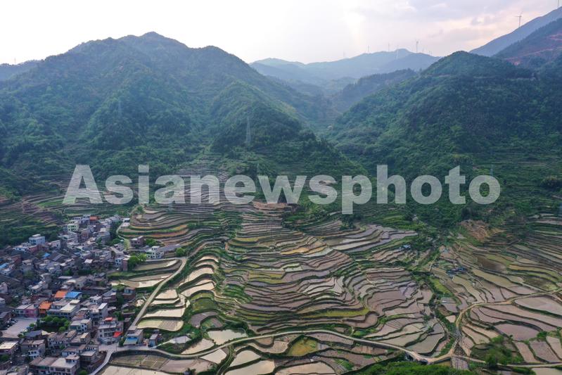 图片说明:2022年4月10日,湖南省郴州市苏仙区良田镇黄家湾村,纵横交错的水田和民居构成一幅春意盎然的乡村美景图。