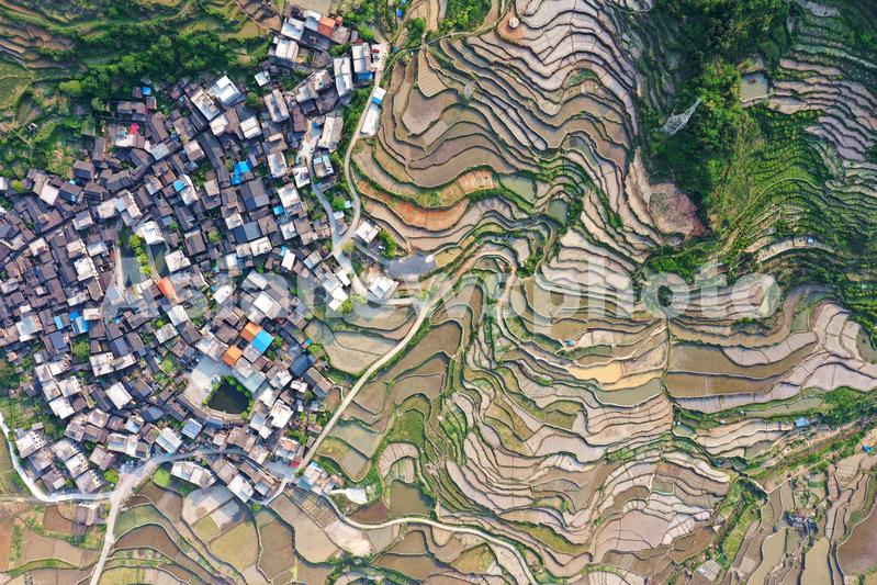 图片说明:2022年4月10日,湖南省郴州市苏仙区良田镇黄家湾村,纵横交错的水田和民居构成一幅春意盎然的乡村美景图。