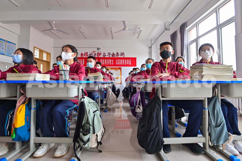 图片说明:2022年4月13日,山东省青州市圣水学校初中三年级学生在上课。